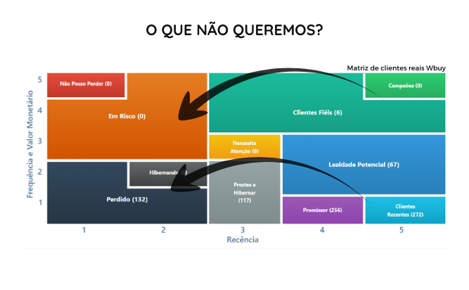 Na primeira imagem, vemos a matriz RFM destacando o movimento que não queremos para nossos clientes. Os clientes de alto valor, mas com menor recência e frequência, começam a se mover para categorias de menor valor e frequência, como "Em Risco" e "Hibernando", eventualmente chegando a "Perdido". Isso representa uma trajetória negativa, onde a inatividade aumenta e a empresa perde clientes valiosos.