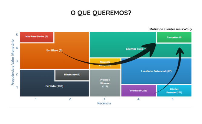 Na segunda imagem, vemos a matriz RFM destacando o movimento desejado para nossos clientes. O objetivo é mover os clientes para categorias de maior recência e frequência, como "Clientes Fiéis" e "Campeões". Isso representa uma trajetória positiva, onde o engajamento aumenta e a empresa mantém clientes valiosos.